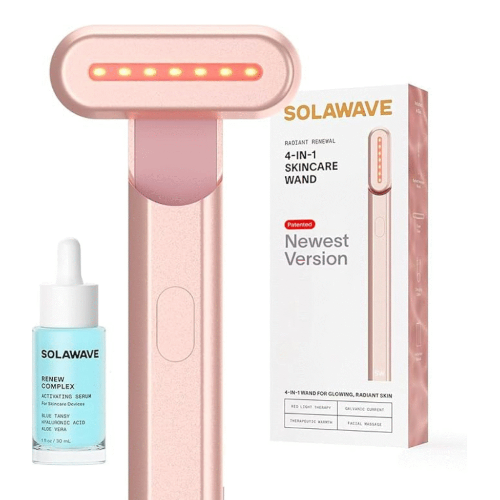 The Solawave 4-in-1 Radiant Renewal Wand is a compact beauty device that combines red light therapy, galvanic current, therapeutic warmth, and facial massage to reduce wrinkles, dark circles, and puffiness. Paired with the Renew Complex Serum—infused with aloe vera, hyaluronic acid, and Blue Tansy—it hydrates and enhances results for radiant, youthful skin. With a 3-minute treatment per area and a rotating head for precise application, this portable, rechargeable wand brings spa-quality skincare into your daily routine, whether at home or on the go.